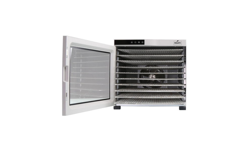 Dry fruits, dry vegetables... but most importantly, dry meat in our 10 Tray Dehydrator. The ten stackable trays are perfect for all different kinds of jerky, plus the 360-degree circulation ensures even cooking for each piece. Temperature adjusts from 90 degrees all the way to 167 degrees Fahrenheit. A removable drip tray is included for easy clean-up, and an LED control is built-in with a 30-hour timer and auto shut off.
