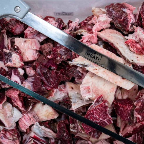 The comfort grip handle of our 16" Hand Meat Saw makes it comfortable and easy to slice through large cuts of meat and bone while processing. The blade tension is adjustable for maximum control, and both the frame and blade are composed of stainless steel for durability.
