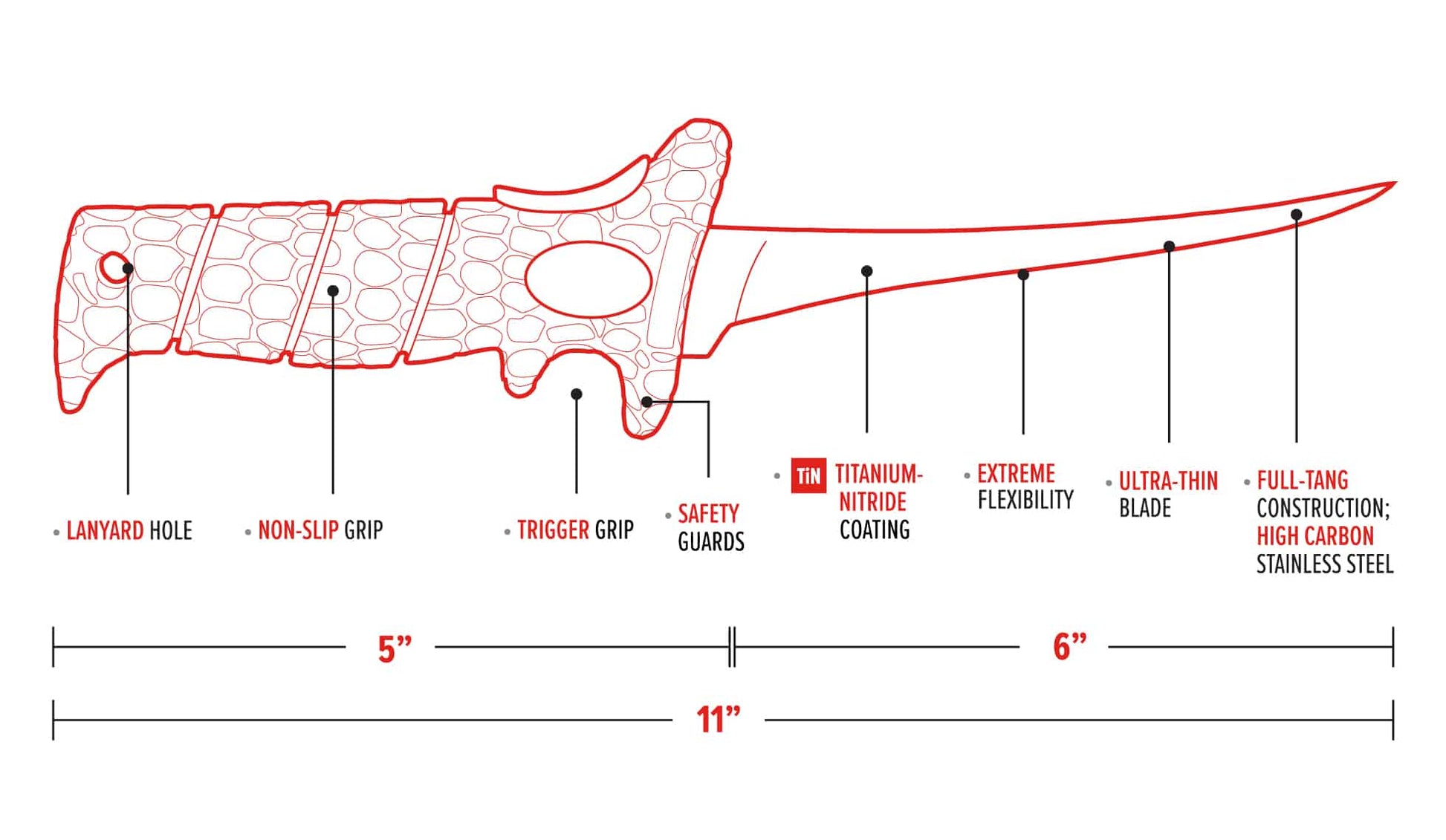 Similar to its big brother, this 6-inch Ultra Flex fillet knife comes loaded with extreme flexibility and a ridiculously thin blade. The combination of the two makes this knife essential for your collection. Bring this knife with you because its full tang construction is designed to be your go-to for everything. Whether you're cutting for detail or bone removal, it will be your best friend. Because it is the little brother to the 8-inch knife, it's suited ideally for Crappie or smaller panfish. This secret weapon is your key to success.