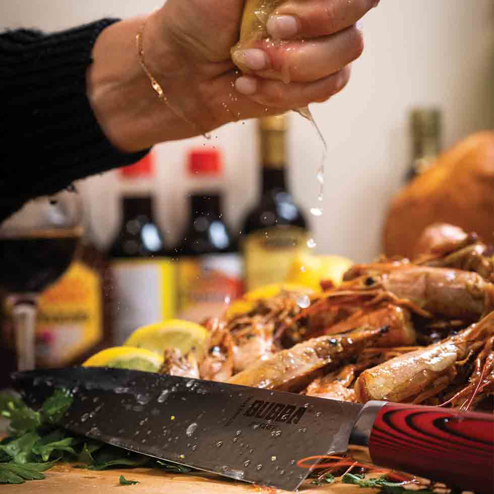 SHARP ON THE WATER AND IN THE KITCHEN EXPERTLY CRAFTEDFEATURES PREMIUM GERMAN STAINLESS STEEL AND G10 HANDLES |
