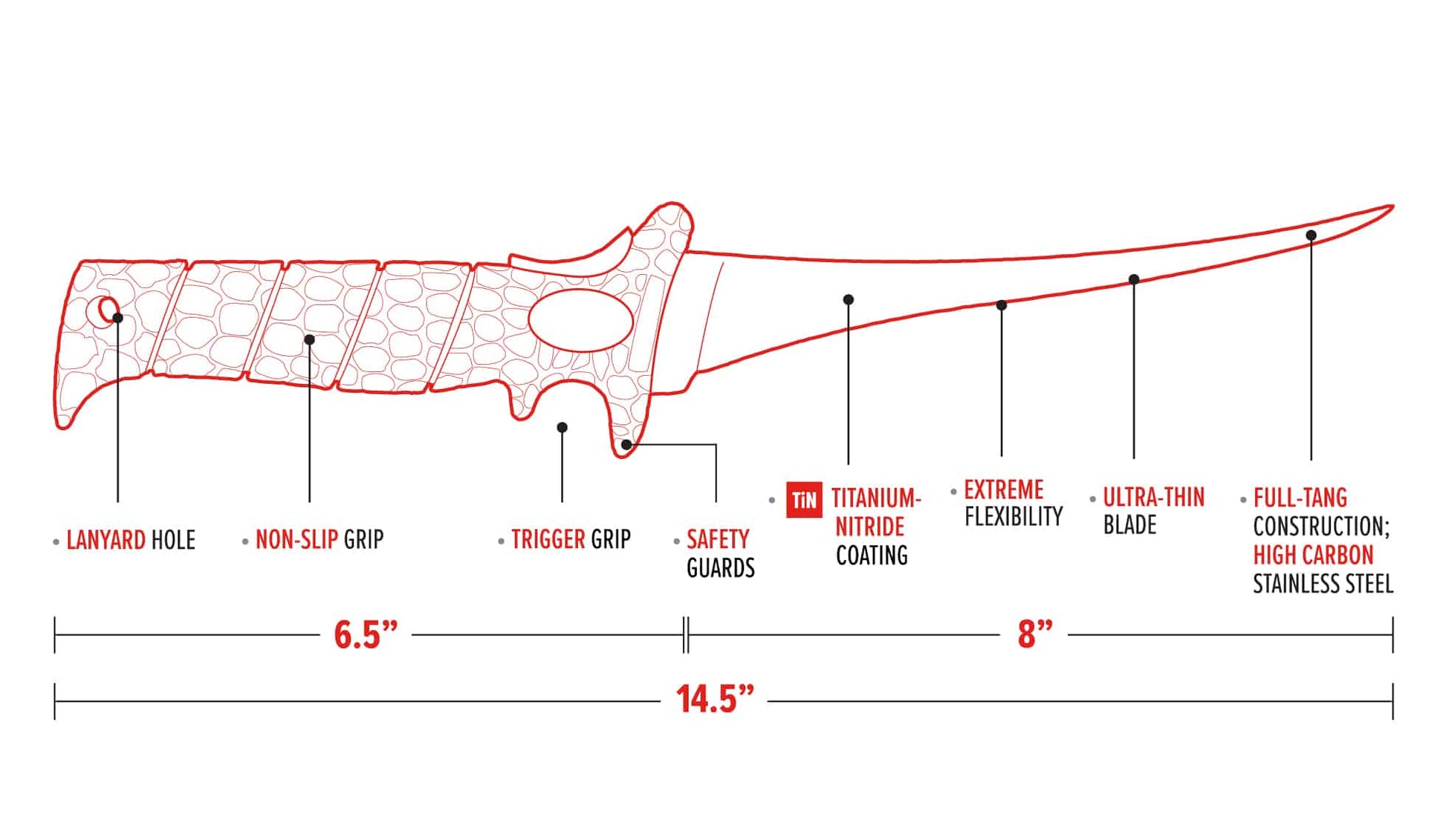 This 8-inch Ultra Flex Fillet Knife is just what you asked for. Its extreme flexibility makes it stand out among its competitors. The sleek, sporty blade cuts precisely for detailing and plucking out bones. The 8-inch blade will triumph your Walleye or Mahi without complaint. Your inner adventurer won't want to leave this fearless tool behind. Bubba also offers this knife in a 6-inch blade option.