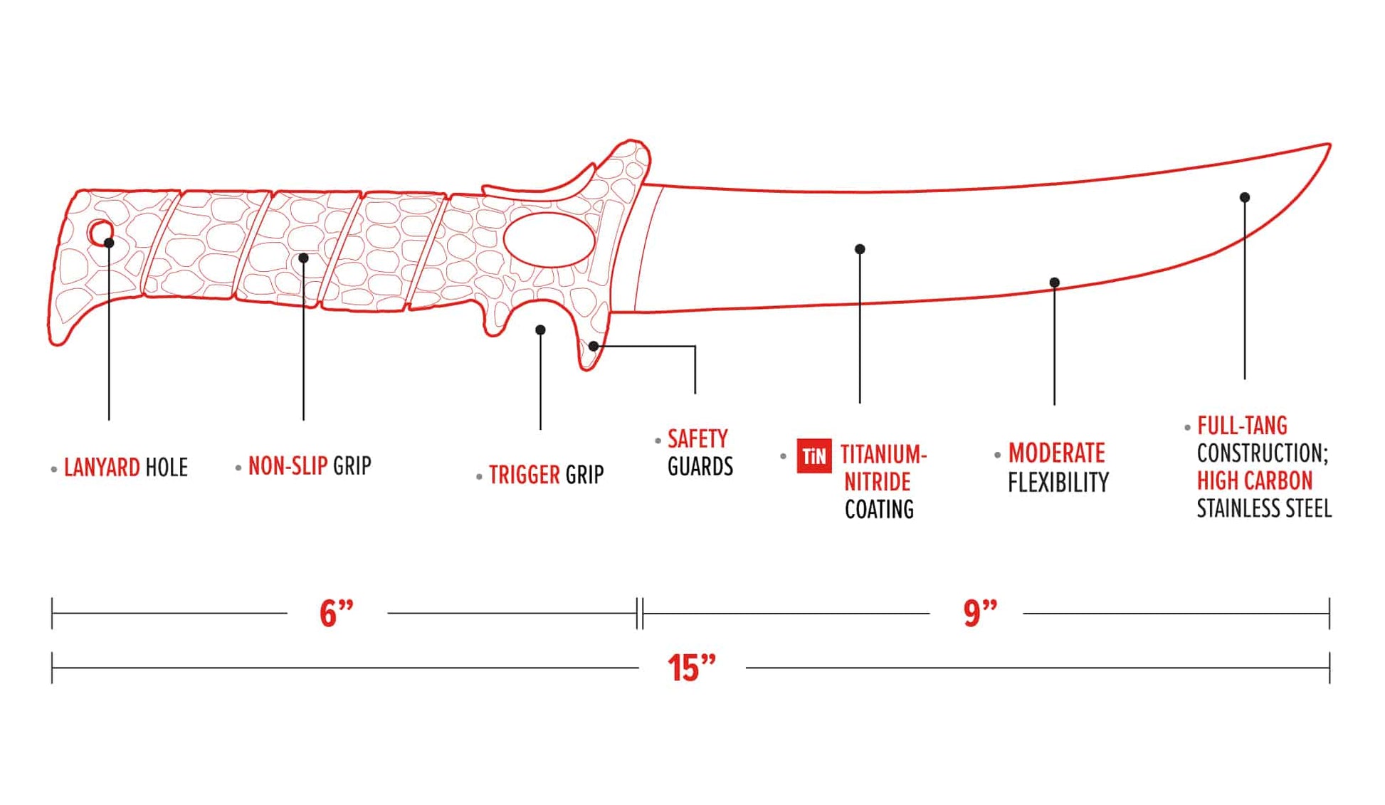 - 9" BLADE WITH 6" HANDLE, OVERALL 15"